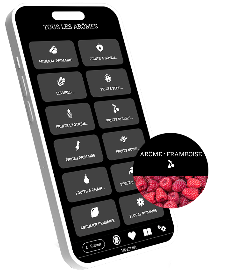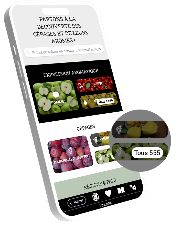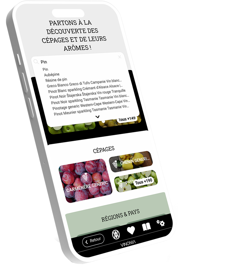 VINONIA est la première appli sur le vin qui permet aux dégustateurs d'aborder le vin par les cépages et les arômes. Grâce à une interconnexion de plus de 140 arômes et de plus de 130 cépages, la dégustation prend un autre sens. L'application vous aidera à appréhender les particularités des différents cépages et à les reconnaître à travers leur expression aromatique mais aussi technique, telle que acidité, corps, tannin – et par conséquence à comprendre le vin.