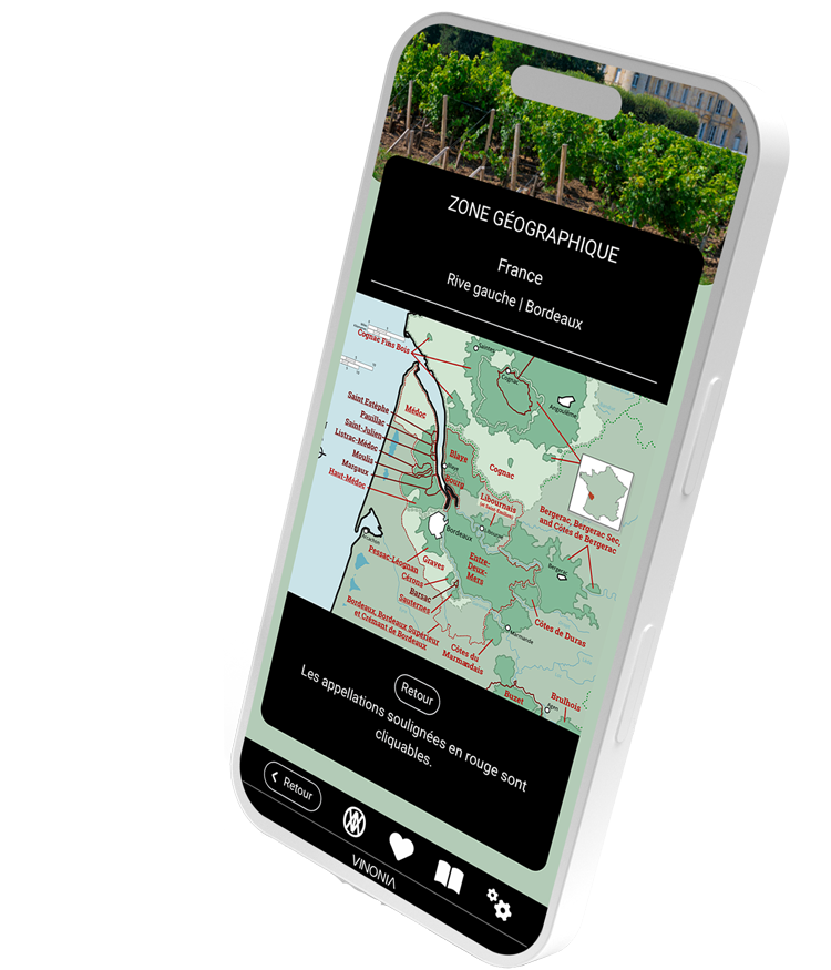 VINONIA est l'unique application dédiée au vin qui offre des cartes interactives et des informations détaillées sur les appellations à l'échelle mondiale.