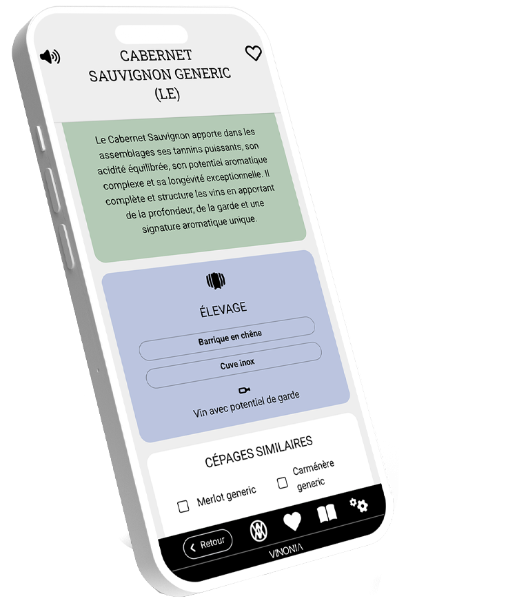 Quasiment tous les éléments de l´application sont cliquables, ce qui vous permet de passer d´un arôme à un cépage, puis à une appellation, revenir vers un autre cépage, découvrir son climat de prédilection, passer de nouveau à une région de production… Bref, vous avez compris : VINONIA est conçu pour les dégustateurs curieux.